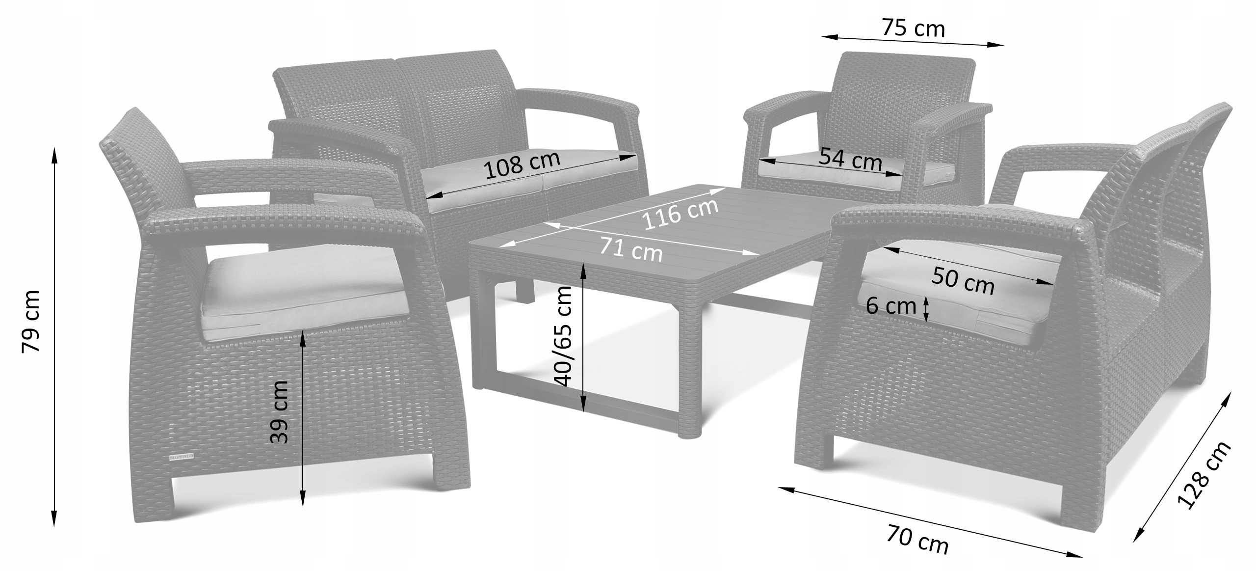 Corfu FIESTA Lyon — це зручний, функціональний комплект садових меблів, який складається з двох двоспальних диванів, двох крісел і столу, який можна встановити у 2 положення : низкое ( кава ) і висока ( вечеря ). Все зроблено з міцного пластику — поліпропілену. Сидіння обладнані зручними подушками на блискавці. Комплект призначений для самостійного складання. Набір ідеально підходить для облаштування садів, терас та інтер'єрів.